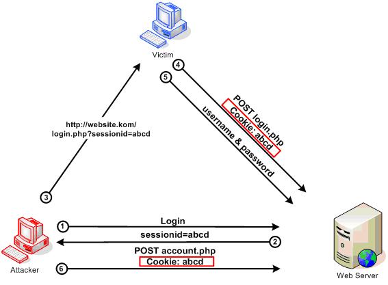 Most browsers support the execution of client-side scripting. In this case, the aggressor could use attacks of code injection as the XSS (Cross-site scripting) attack to insert a malicious code in the hyperlink sent to the victim and fix a Session ID in its cookie. Using the function document.cookie, the browser which executes the command becomes capable of fixing values inside of the cookie that it will use to keep a session between the client and the Web Application.